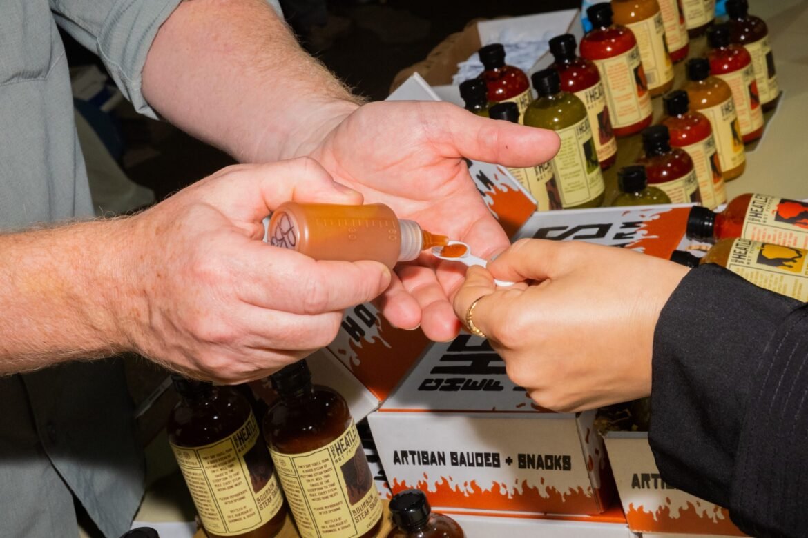 A few standout vendors for us this year included Queen Majesty Hot Sauce out of Long Island City; Old Bones Chili Co. out of Houston; Boulder Colorado’s Seed Ranch Flavor Co.; Funky’s Hot Sauce from Bellingham, Washington; Dirty Dick’s Hot Sauce out of Norwell, Massachusetts; and Chef Heatley’s Hot Pepper Farm from, fittingly, Sandwich, Illinois. Each offered small tastings of their individual flavors on disposable spoons — though some of the more advanced attendees brought their own spoons, pretzels and chips.