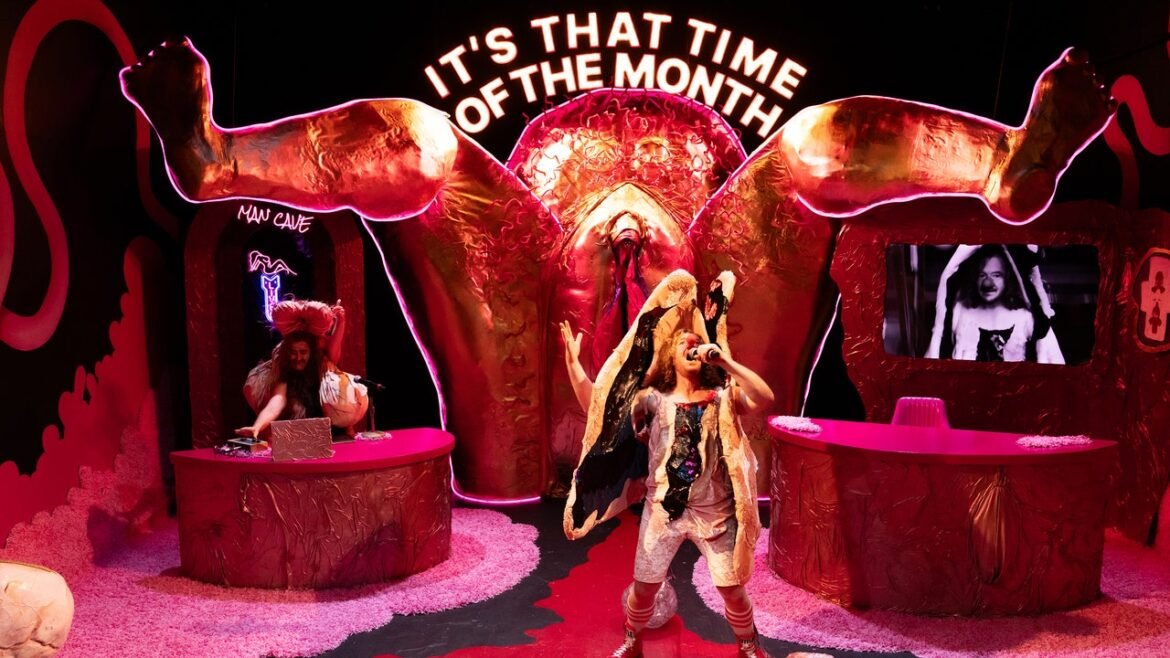 Snatch Adams, a six-foot-tall walking vagina working as a red-nose clown, would usually be entertaining folks on the vaudevillian “Borsch” Belt comedy circuit—“borsch” as in (a)bort(ion)—but extremists have been closing Planned Parenthoods. There’s certainly not a lot of other things an unemployed, six-foot-tall vagina-clown can do. Start a podcast? Launch a wellness app? Snatch (Becca Blackwell) and their dear friend Tainty McCracken (Amanda Duarte) experience a flicker of confusion, but then the right idea strikes like a period on a day you’re wearing white pants: air a TV talk show called “It’s That Time of the Month,” which mashes together the best of Conan O’Brien, “Pee-wee’s Playhouse,” and performance artist Carolee Schneemann in her “Interior Scroll” era.