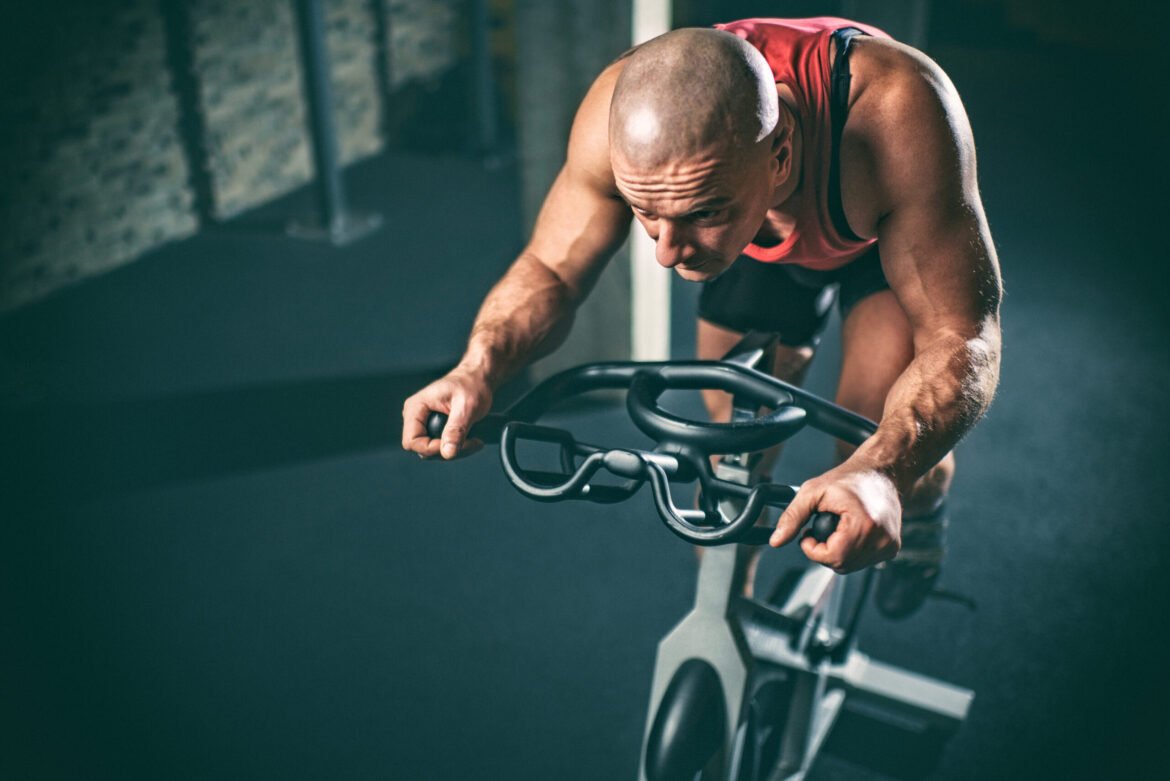 Man on stationary bicycle working hard.