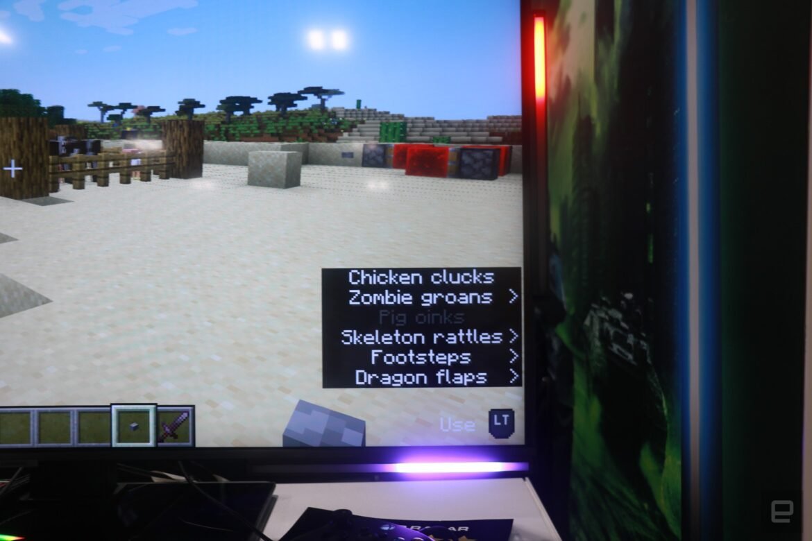 The setup is fairly simple. A box plugs into a gaming console to interpret audio output and converts that data into lights. A series of RGB light bars surround the screen, and display different colors depending on the type of sound coming from the respective direction they represent. Put simply, it means that if you’re walking around a Minecraft world, like I did at the company’s booth on the show floor, you’ll see lights of different colors appear on the different bars.