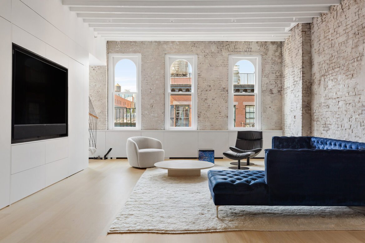 Perched atop a classic 1920s Soho building, this six-room co-op at 45 Crosby Street retains the treasured ingredients of loft living, brought into the 21st century with a pristine top-of-the-line renovation helmed by contemporary design practice RAAD Studio. Asking $5,250,000, the turnkey home features direct elevator entry, 13-foot ceilings, large, light-filled rooms, and exposed original brick and beams, highlighted by luxurious fixtures and finishes in innovative modern materials.