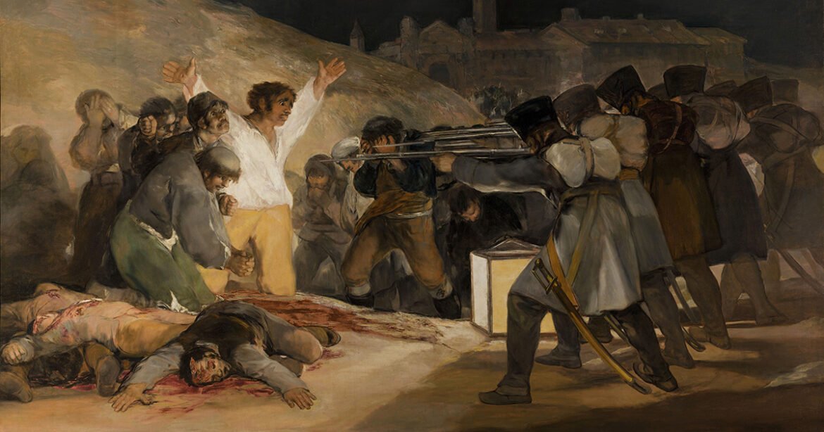 One of the most iconic paintings to depict the horrors of war is Francisco Goya’s The Third of May 1808, which depicts an incident during the Peninsular War against Napoleon in Spain.The nighttime scene of a group of Spanish civilians facing execution by a French firing squad was remarkable for its time, being utterly devoid of the patriotic glorification of war that characterized most contemporary war art. Goya based the painting on reprisals the French army carried out against citizens of Madrid in the wake of the Dos de Mayo Uprising against Napoleon’s occupation forces.