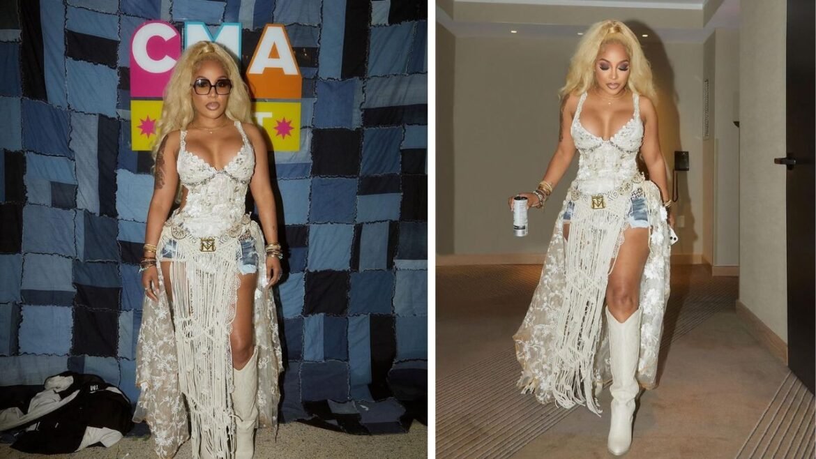 ‘Tennessee’ singer K. Michelle is still in her country music bag, and performed at the CMA fest in Nashville over the weekend in an off white Tanya Marie Handmade Goddess Gown.