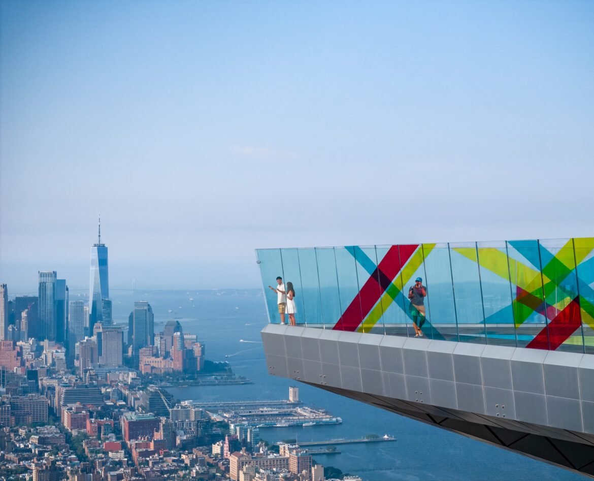 Most of the outdoor sky deck remains clear, with stripes of vibrant hues on the glass panels revealing the city in a new way, keeping the unobstructed 360-degree views of New York City intact.