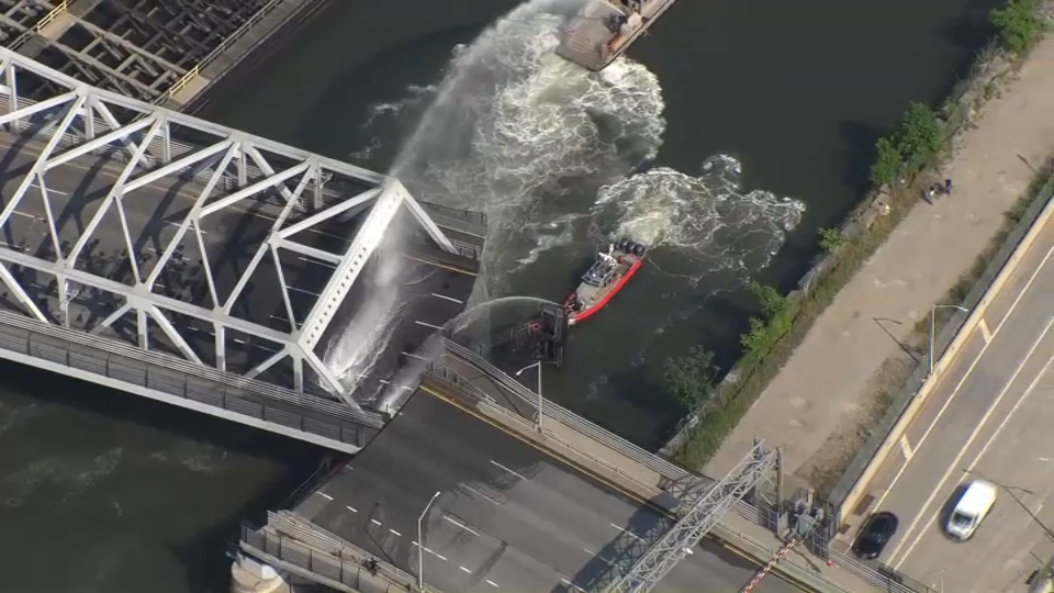 Video from Chopper 4 captured crews on a couple of boats spraying water from the river below up onto the bridge in an effort to cool down the steel. Crews from the FDNY and DOT were said to be on hand.