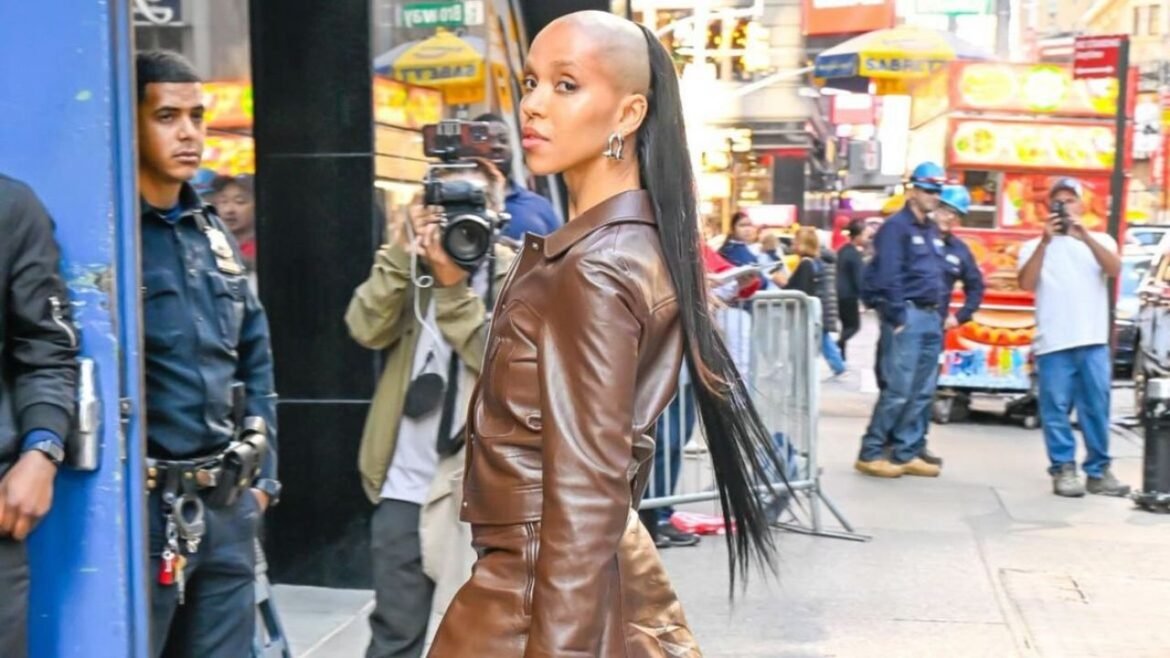 British musician FKA Twigs was photographed in New York promoting ‘The Crow,’ and she looked as if she came out of the matrix in a chocolate leather Celine look paired with matching Windowsen boots.