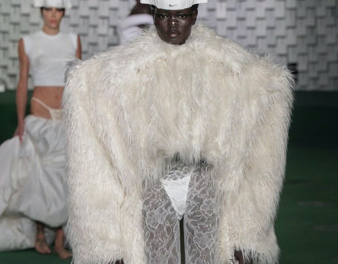 Cool kids snaked down the sidewalk outside of the Espace Niemeyer, a former Headquarters of the Communist Party which now moonlights as a futuristic venue with a stark geodesic sphere decorating the lawn. Guests, mostly clad in all black, sauntered into the spaceship-like space, ambling into an inner dome that beamed lights down on the collection amidst glittering chrome tiles. Lithe models sauntered slowly down the runway, most boasting barely there sheer lace bodysuits, dresses and pants that boldly exposed breasts and thongs.