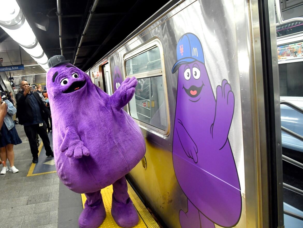 As part of a promotion from McDonald’s, decals of Grimace were placed across all 10 cars of a 7-train headed to the ballpark on Tuesday. The mascot boarded the train at Hudson Yards just before 1:30 p.m., according to the MTA.