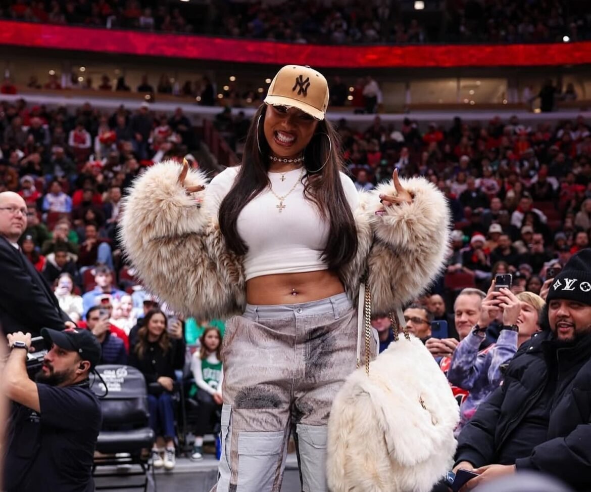 Megan Thee Stallion attended the Bulls vs. Celtics game wearing a @sonofjamesla custom @yankees hat, a Dsquared2 jacket, $546 Who Decides War Gray Darning Cargo Pants, a $7,200 YSL Niki Oversized Fur Bag, and Louis Vuitton x Timberland boots, styled by @isiah.ahmad .