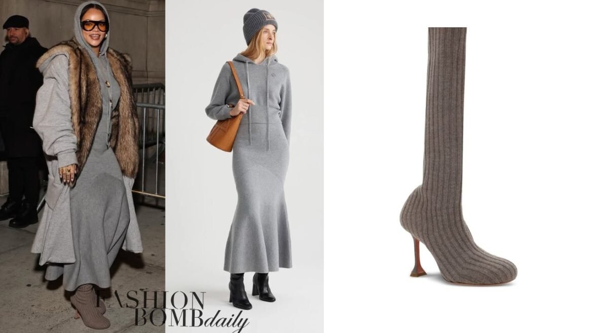 Rihanna layered her Patou set with a light grey Loewe fur jacket, and accessorized with black and yellow Bottega Veneta frames, and grey Amina Muaddi knit boots.