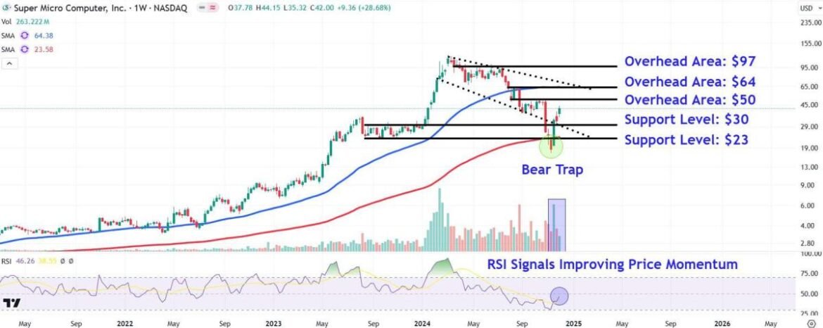 Investors should watch key overhead areas on Supermicro’s weekly chart around $50, $64, and $97, while monitoring major support levels near $30 and $23.