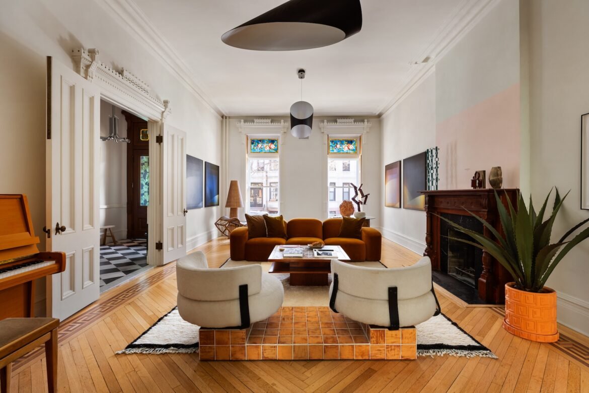 At 25 feet wide with five stories and a separate garden flat, the 1884 late-Italianate-style townhouse at 234 Clinton Street would be a dream home for just about anyone. But the brick-fronted Brooklyn residence achieves icon status with a stem-to-stern renovation by celebrated architecture firm MADE, which added a vibrant color palette to design-showcase interiors while preserving the home’s history. Asking $12,995,000, details like pale mint green stairs, a modern kitchen clad in emerald tiles, and a top-floor studio make this one of the neighborhood’s most exciting offerings.