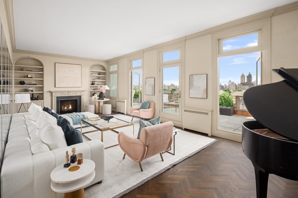 Stunning Central Park views complement the room’s pre-war architecture, and tall glass doors open onto a sprawling terrace.