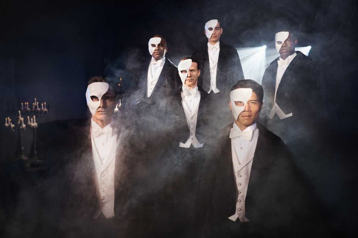 Will the real Phantom please stand up? Hugh Panaro, Nik Walker, Jeff Kready, Clay Singer, Telly Leung and Kyle Scatliffe in “Masquerade.”
