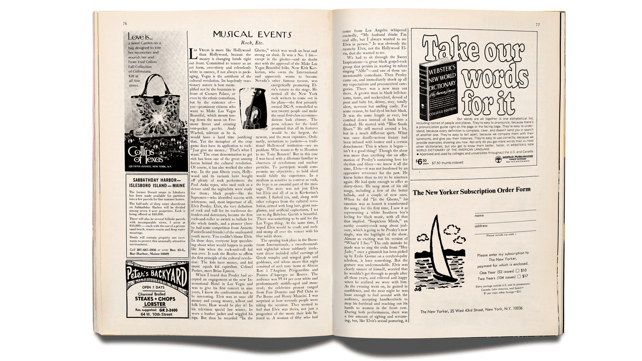 There’s a striking moment in her piece, a sort of mini-twist, when you can sense Willis’s mode of observation shift from bewilderment to something that reads as genuine fascination, bordering on outright enjoyment. It happens after Elvis arrives onstage, when Willis takes him in for the first time. She’s amazed by his new, slimmer physique (“sexy, totally alert”), but also puzzled by his hair, dyed black and no longer slicked into the famous ducktail. Her confusion gives way to a sense of wonder when she realizes that, despite his efforts to look younger, he’s not interested in performing as he did in his youth. She marvels at his playfulness, becomes fixated on his earnestness; she writes, of his performance of “In the Ghetto,” that “for the first time, I saw it as representing a white Southern boy’s feeling for black music, with all that that implied.” Although Willis herself was only twenty-seven—the magazine had hired her the previous year—she appreciated his maturation. “He knew better than to try to be nineteen again,” she notes. “He had quite enough to offer at thirty-three.”