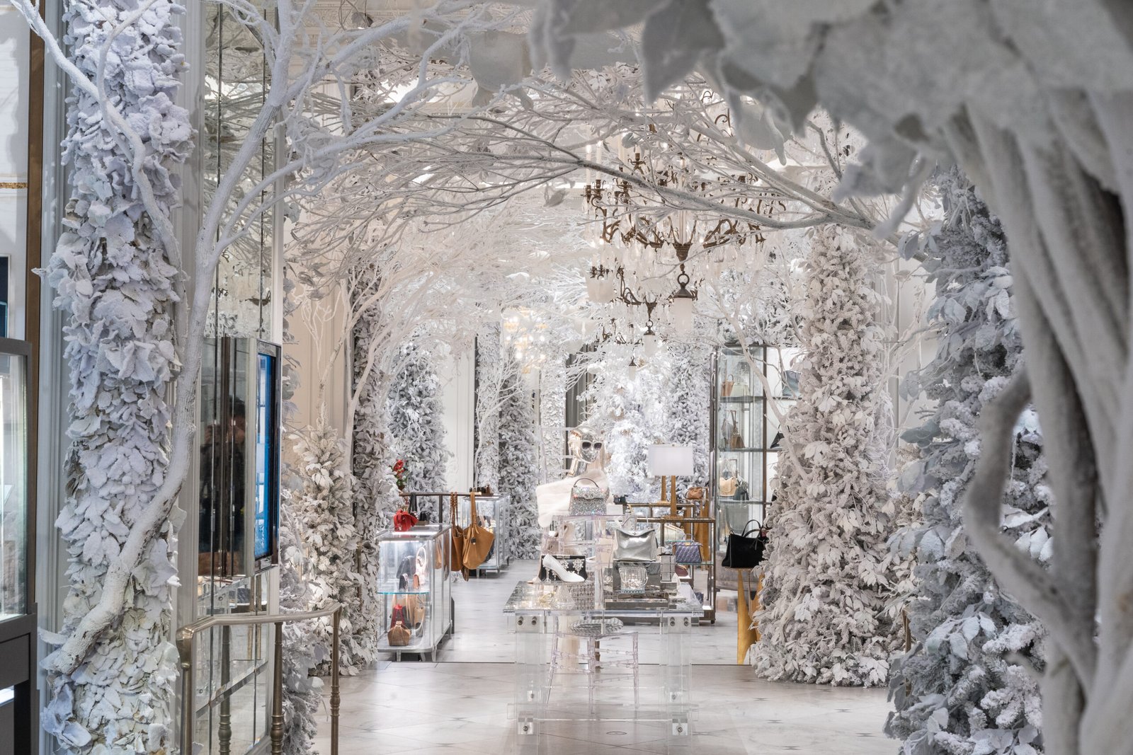 Inside, a winter wonderland awaits as luxurious jewelry, purses, and clothes are displayed in a whimsical white-out with woodland birds “fly” above and snow-covered trees line the halls — a sight to behold.